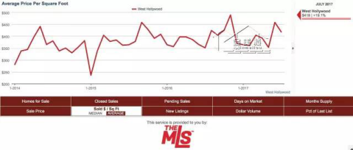 7月份西好萊塢房屋銷售均價為$418每平方英尺,比去年同期增長19.1%,較上個月下降8.7%。