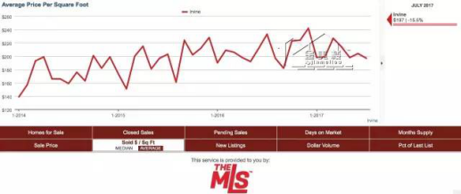 7月份爾灣房屋銷售均價為$197每平方英尺,比去年同期下降15.5%,較上個月下降3.4%。