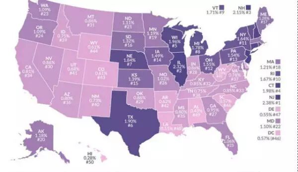 根據(jù)美國人口普查局的統(tǒng)計(jì),全美屋主2015年平均交納房地產(chǎn)稅為2149美元。2015年全美各州房地產(chǎn)稅率,最低的是夏威夷,為0.27%,最高的是新澤西,為2.35%,新澤西的稅率是夏威夷的8.7倍。也就是說,在夏威夷一棟20萬美元的房產(chǎn),只需交稅540美元,而在新澤西則需交稅4700美元。