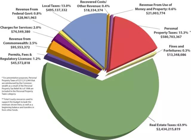 弗吉尼亞州費(fèi)爾法克斯縣2016年預(yù)算,房地產(chǎn)稅占政府收入的63.9%